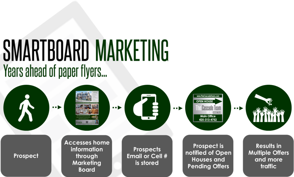 Our permanent Smart Flyers, never run out, get soggy when it rains, and are bigger than paper flyers. They feature large photos and lots of details about the property. Buyers can text for even more info and photos and also chat with your Cascade Team agent.